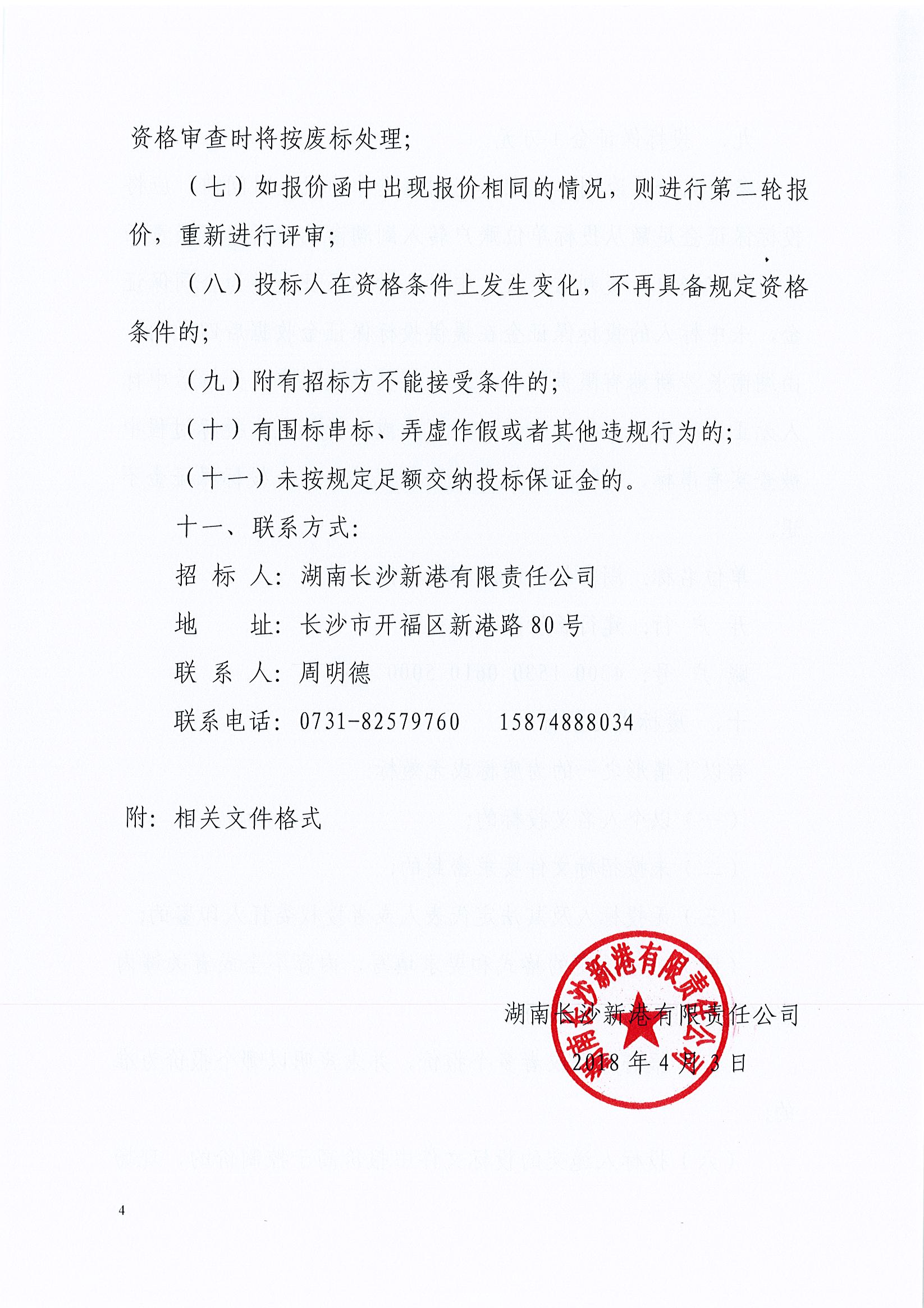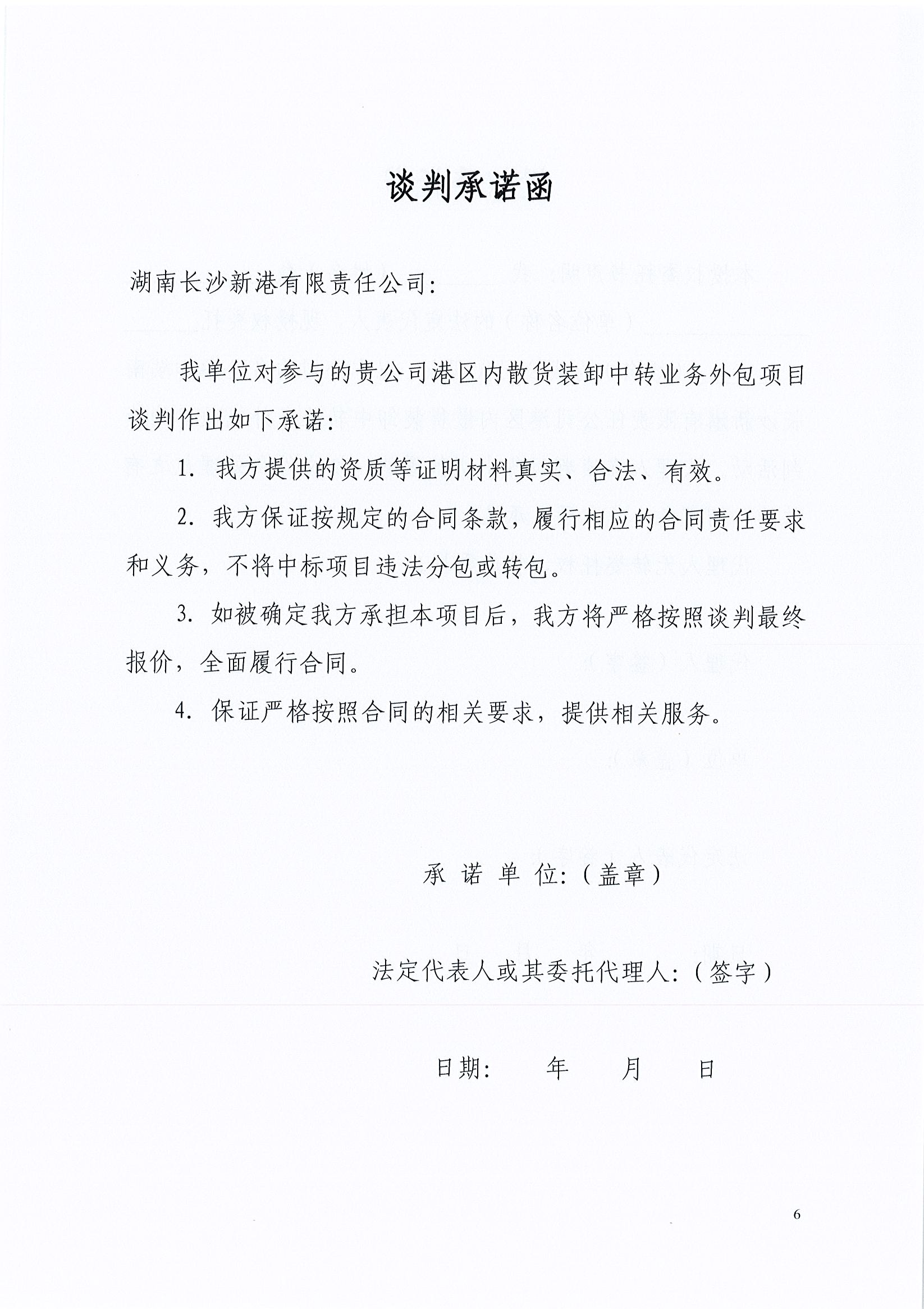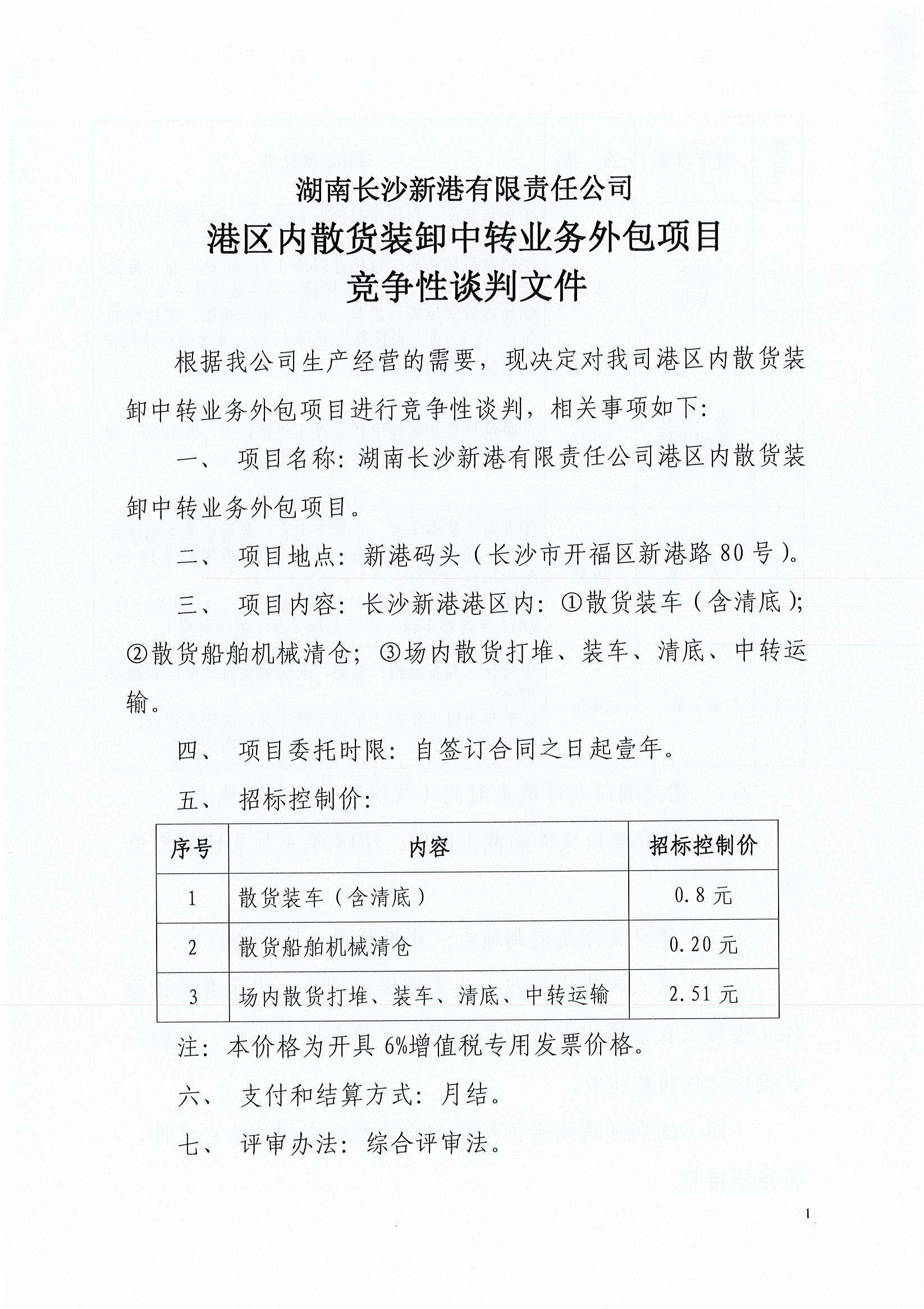 我公司決定對(duì)港區(qū)內(nèi)散貨裝卸中轉(zhuǎn)業(yè)務(wù)外包項(xiàng)目按照一般競爭性談判方式選擇外包單位,歡迎符合條件的單位參與項(xiàng)目的競爭談判。 一、 項(xiàng)目名稱:湖南長沙新港有限責(zé)任公司港區(qū)內(nèi)散貨裝卸中轉(zhuǎn)業(yè)務(wù)外包項(xiàng)目 二、 項(xiàng)目內(nèi)容: 長沙新港港區(qū)內(nèi):①散貨裝車(含清底);②散貨船舶機(jī)械清倉;③場內(nèi)散貨打堆、裝車、清底、中轉(zhuǎn)運(yùn)輸。 三、 項(xiàng)目委托期限:自簽訂合同之日起壹年。 四、 資格及資質(zhì)要求: (一)本項(xiàng)目不接受聯(lián)合體投標(biāo); (二)投標(biāo)人須自有大鏟車、小鏟車、轉(zhuǎn)運(yùn)自卸車輛,能保證我司兩條生產(chǎn)作業(yè)線同時(shí)作業(yè); (三)投標(biāo)人鏟車司機(jī)、車隊(duì)司機(jī)須持有相關(guān)職業(yè)資格證; (四)投標(biāo)人遞交響應(yīng)文件時(shí)須提交以下證明材料(復(fù)印件需加蓋公章): 1.企業(yè)法人營業(yè)執(zhí)照副本復(fù)印件; 2.法人資格證明書或具有單位公章及法定代表人簽章的授權(quán)委托書、法人身份證原件(或復(fù)印件); 3.投標(biāo)人自有車輛購置證明材料、司機(jī)職業(yè)資格證明材料復(fù)印件; 4.投標(biāo)人類似項(xiàng)目業(yè)績證明材料; 5.投標(biāo)人身份證原件及復(fù)印件。 五、招標(biāo)文件的獲取方式:招標(biāo)文件見本公告附件,投標(biāo)人在投標(biāo)截止時(shí)間前可自行下載或前往我司515室領(lǐng)取。 六、遞交響應(yīng)文件截止時(shí)間(及談判時(shí)間)和地點(diǎn): (一)遞交響應(yīng)文件的截止時(shí)間:2018年4月9日上午9:30。 (二)遞交文件及談判地點(diǎn):新港公司一樓北會(huì)議室。 (三)法人代表或授權(quán)人代表需準(zhǔn)時(shí)到會(huì),出示身份證原件(授權(quán)人代表需出示授權(quán)委托書)并簽名以示出席,否則,其投標(biāo)文件將被拒收。 (四)逾期送達(dá)或者不按談判文件要求密封的響應(yīng)文件,將拒絕接收。 七、招 標(biāo) 方:湖南長沙新港有限責(zé)任公司 聯(lián) 系 人:周明德 聯(lián)系電話: 15874888034 2018年4月3日 附件: