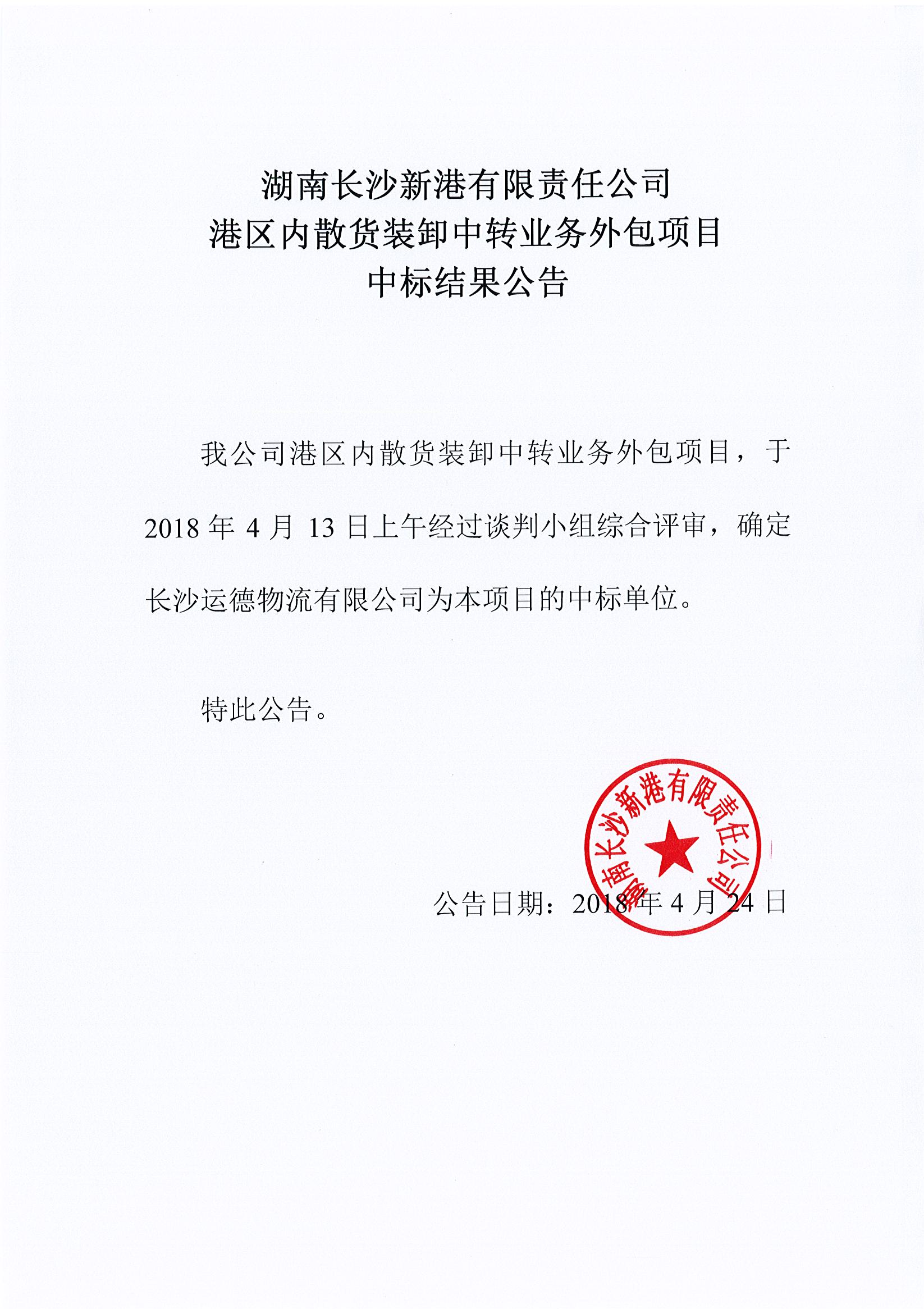 湖南長沙新港有限責(zé)任公司 港區(qū)內(nèi)散貨裝卸中轉(zhuǎn)業(yè)務(wù)外包中標(biāo)結(jié)果公告