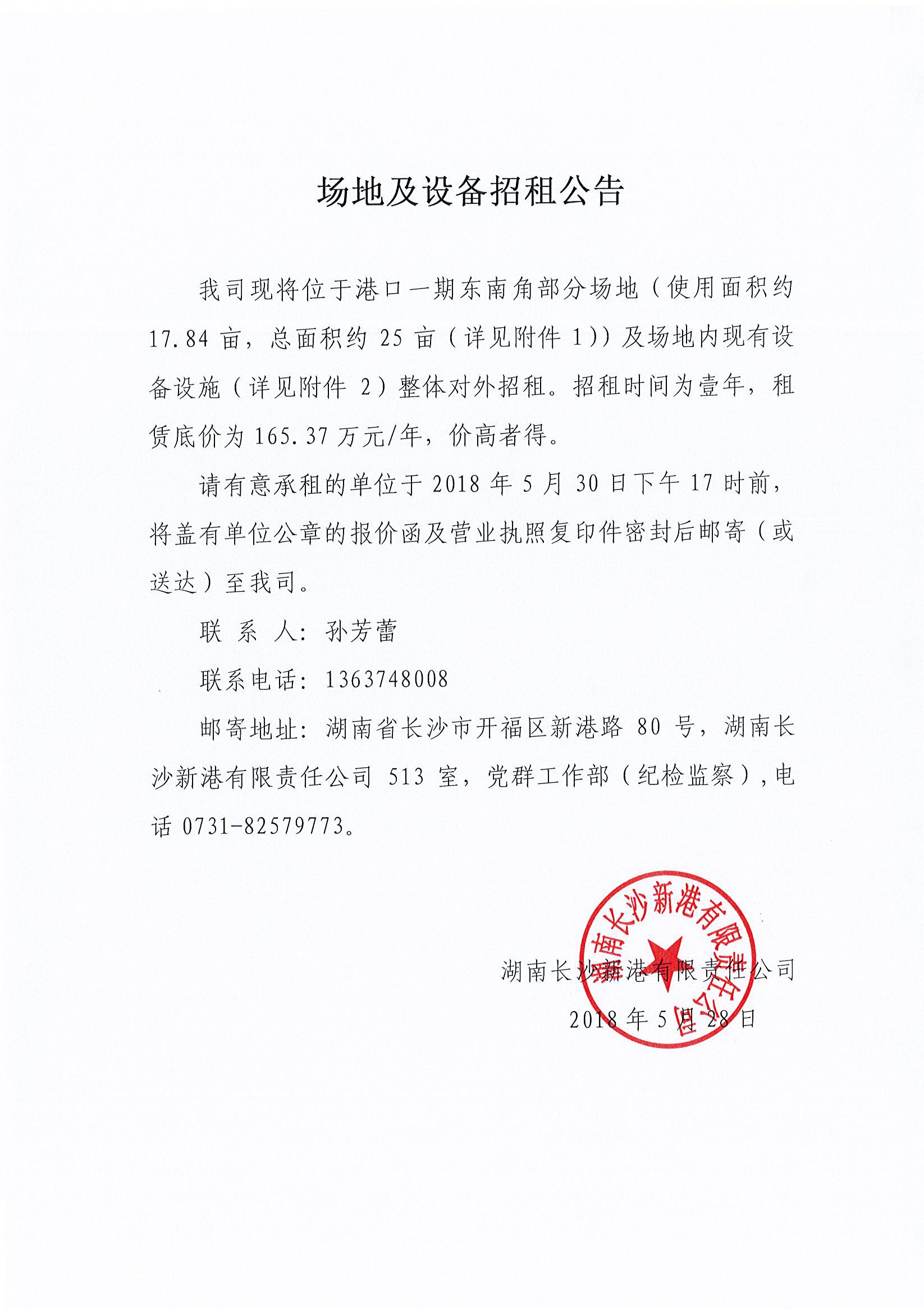 湖南長(zhǎng)沙新港有限責(zé)任公司 場(chǎng)地及設(shè)備招租公告