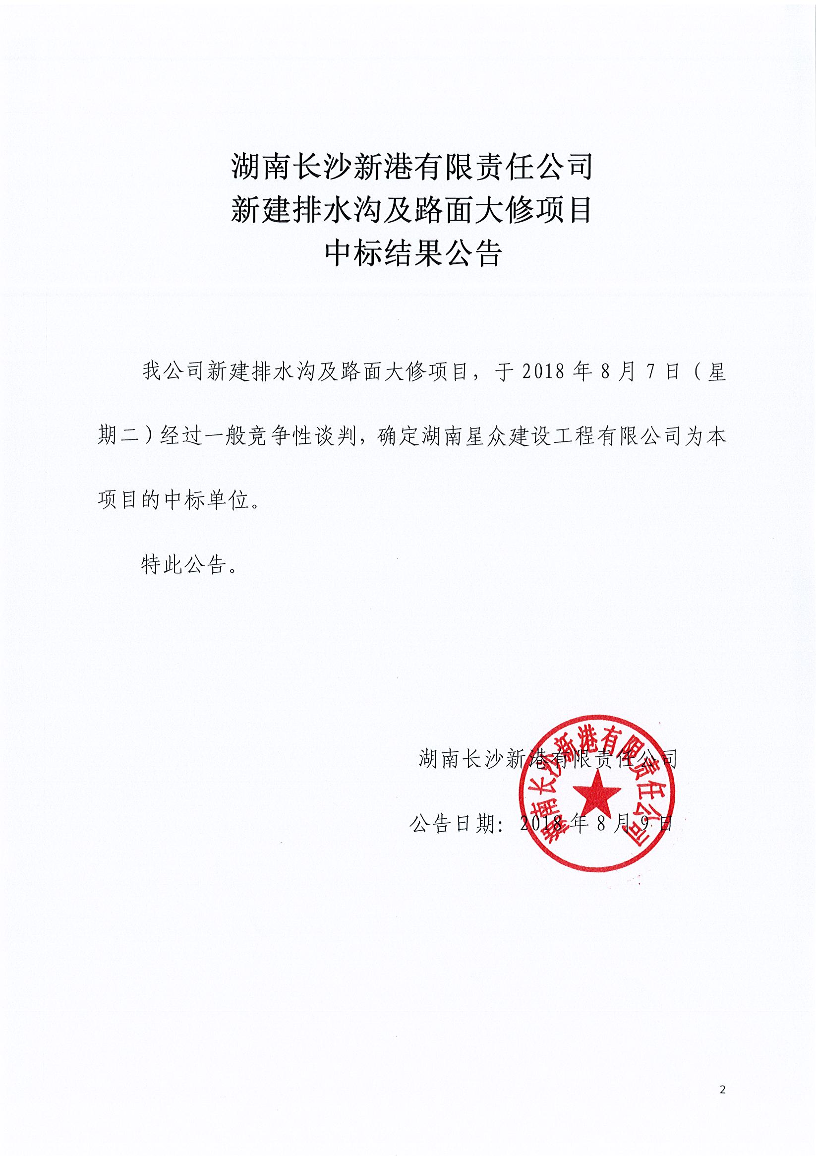 湖南長(zhǎng)沙新港有限責(zé)任公司 新建排水溝及路面大修項(xiàng)目中標(biāo)結(jié)果公告