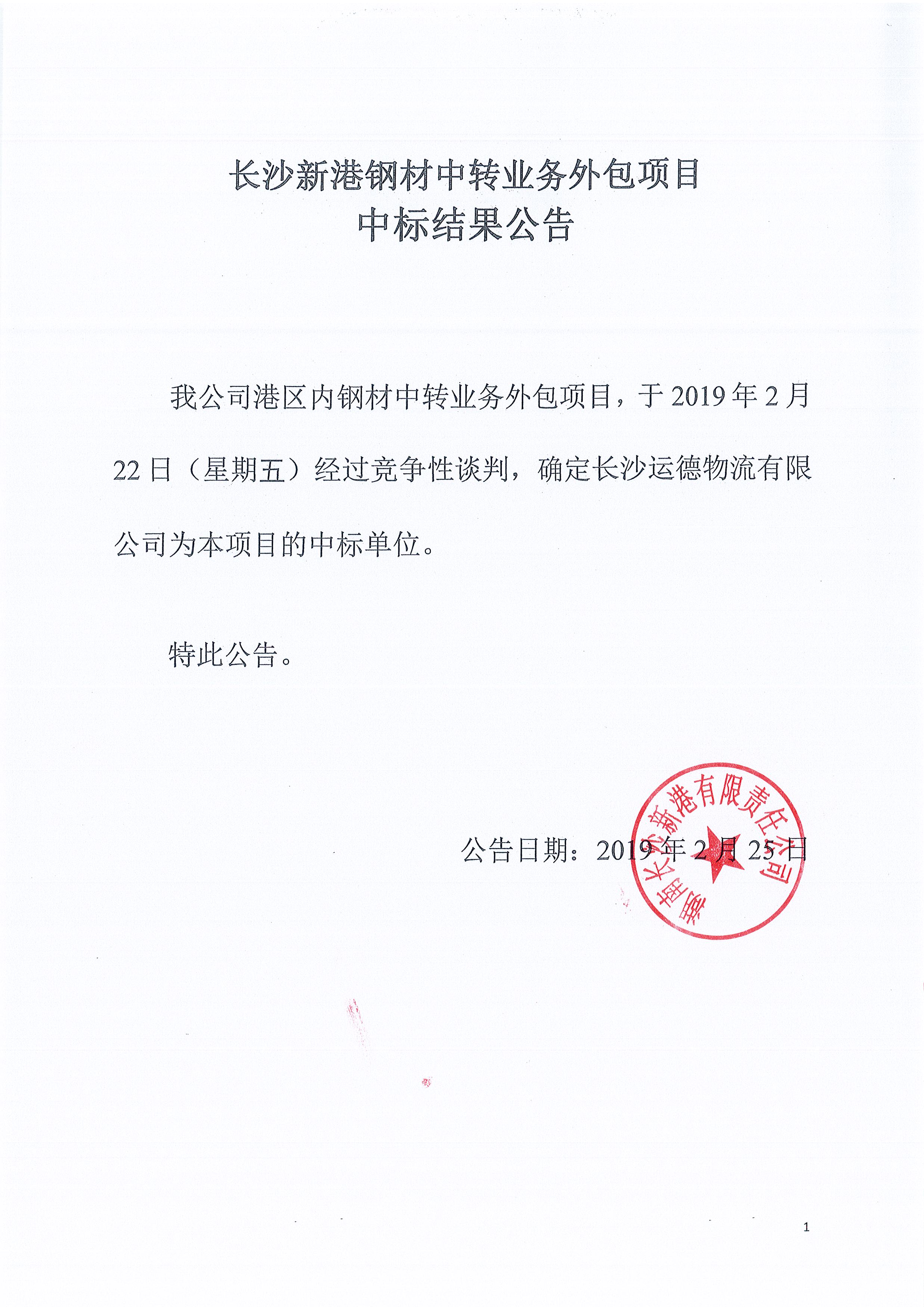 長(zhǎng)沙新港鋼材中轉(zhuǎn)業(yè)務(wù)外包項(xiàng)目中標(biāo)結(jié)果公告