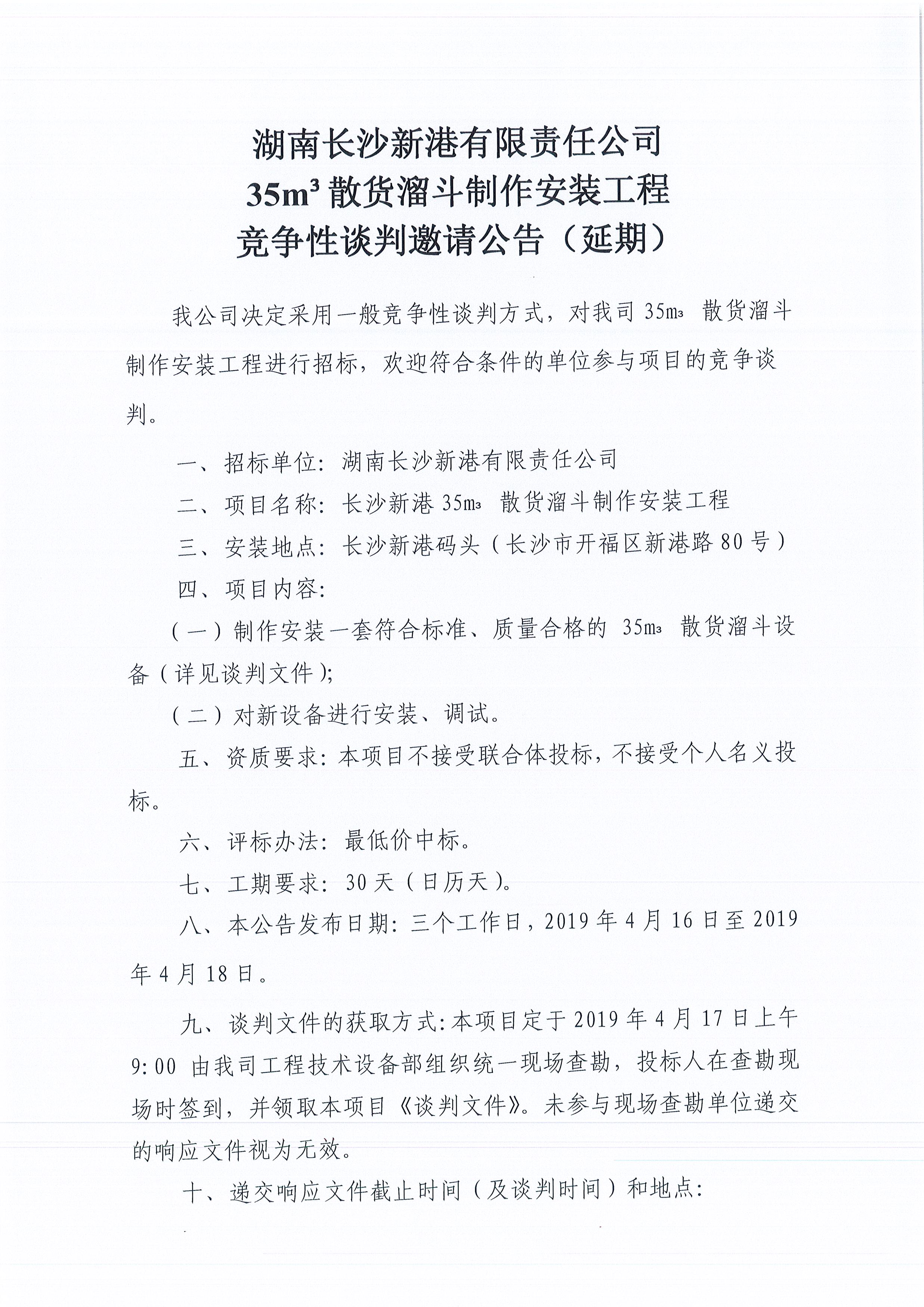 湖南長(zhǎng)沙新港有限責(zé)任公司35m³散貨溜斗制作安裝工程競(jìng)爭(zhēng)性談判邀請(qǐng)公告(延期))