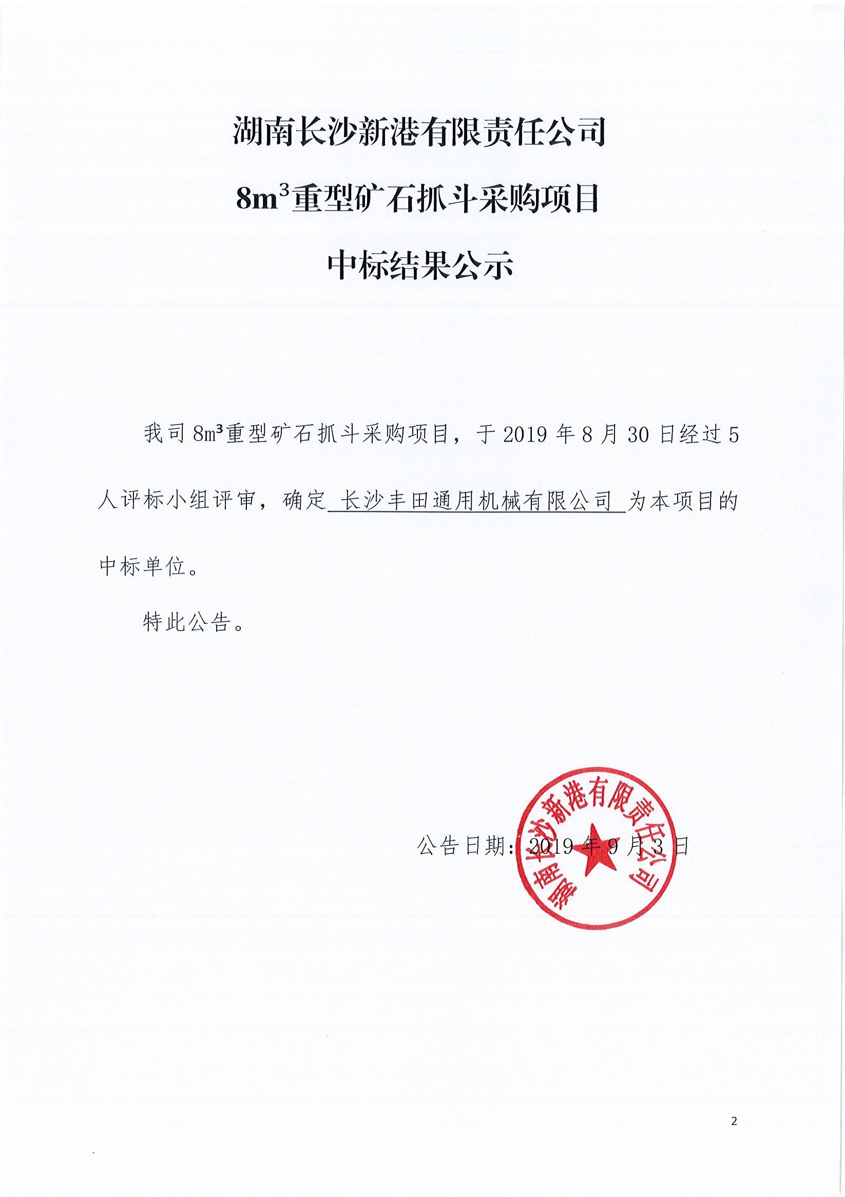 湖南長沙新港有限責任公司8m³重型礦石抓斗采購項目中標結(jié)果公示