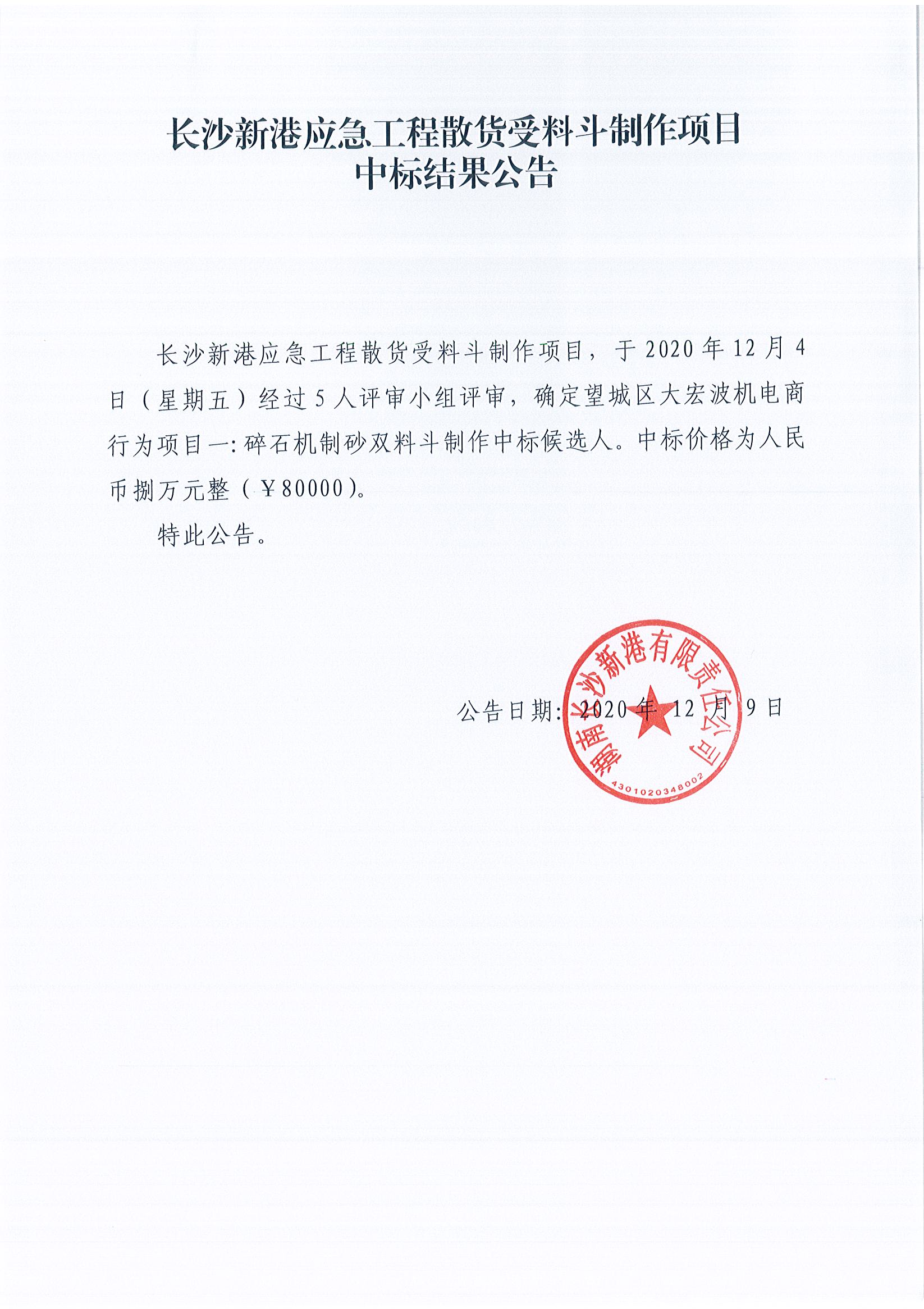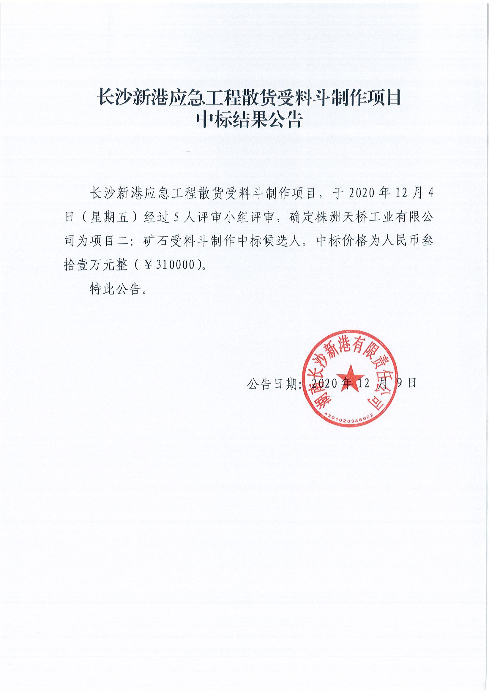 長沙新港應(yīng)急工程散貨受料斗制作項(xiàng)目中標(biāo)結(jié)果公告