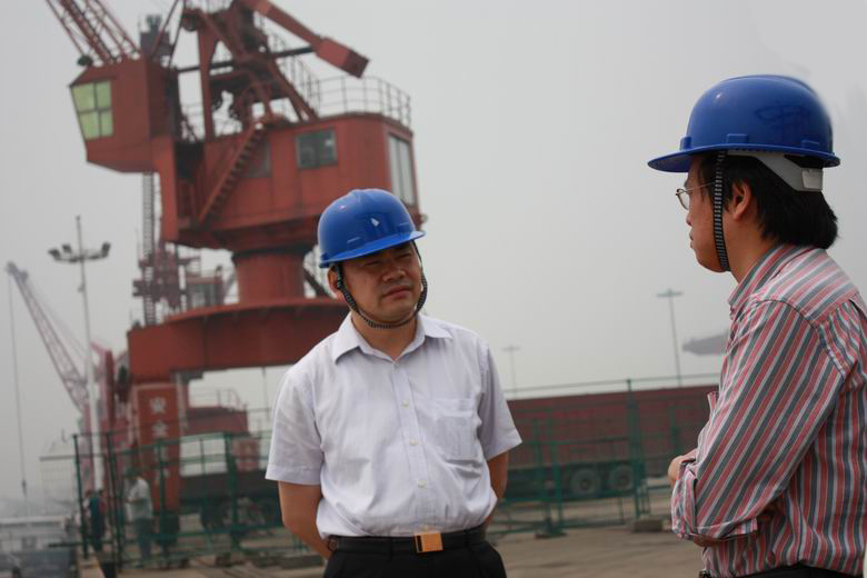 深圳市鹽田港集團(tuán)有限公司副總經(jīng)理徐云國(左一)在碼頭上與長(zhǎng)沙新港有限責(zé)任公司副總經(jīng)理張韜(左二)就港口發(fā)展進(jìn)行交流。 |