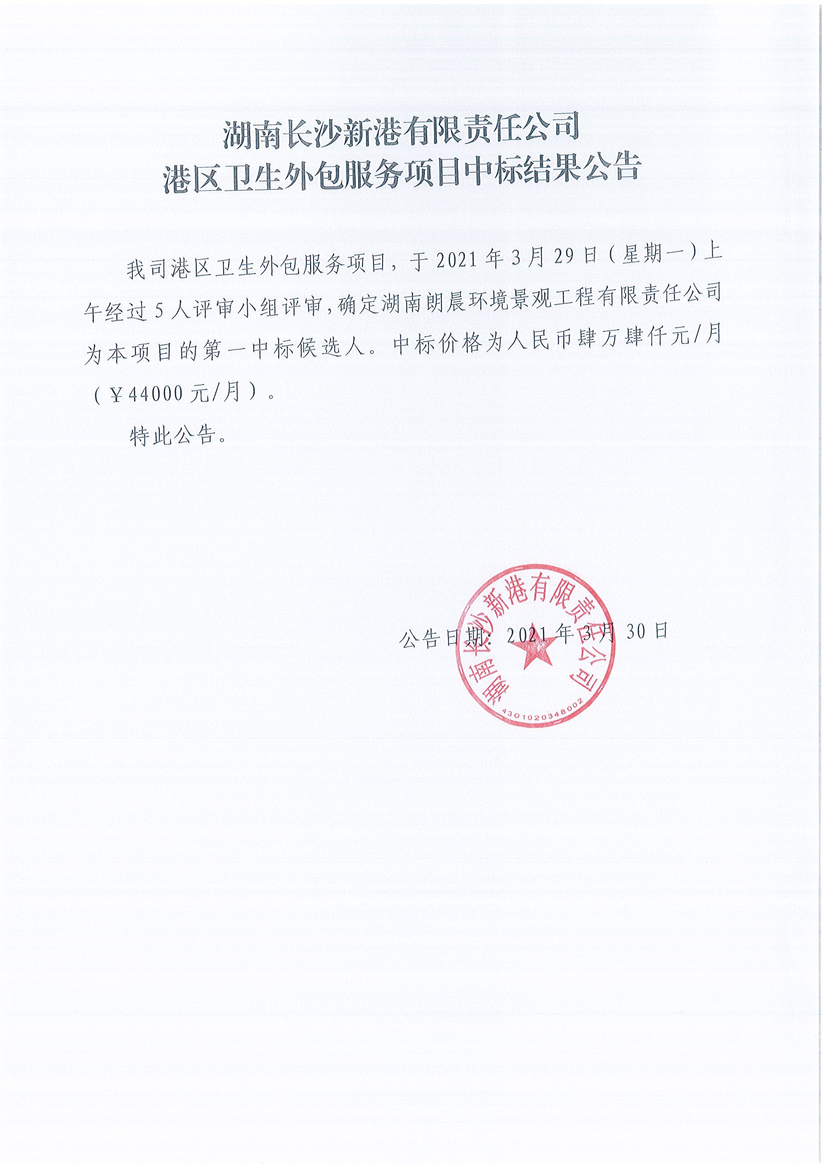湖南長(zhǎng)沙新港有限責(zé)任公司港區(qū)衛(wèi)生外包服務(wù)項(xiàng)目中標(biāo)結(jié)果公告
