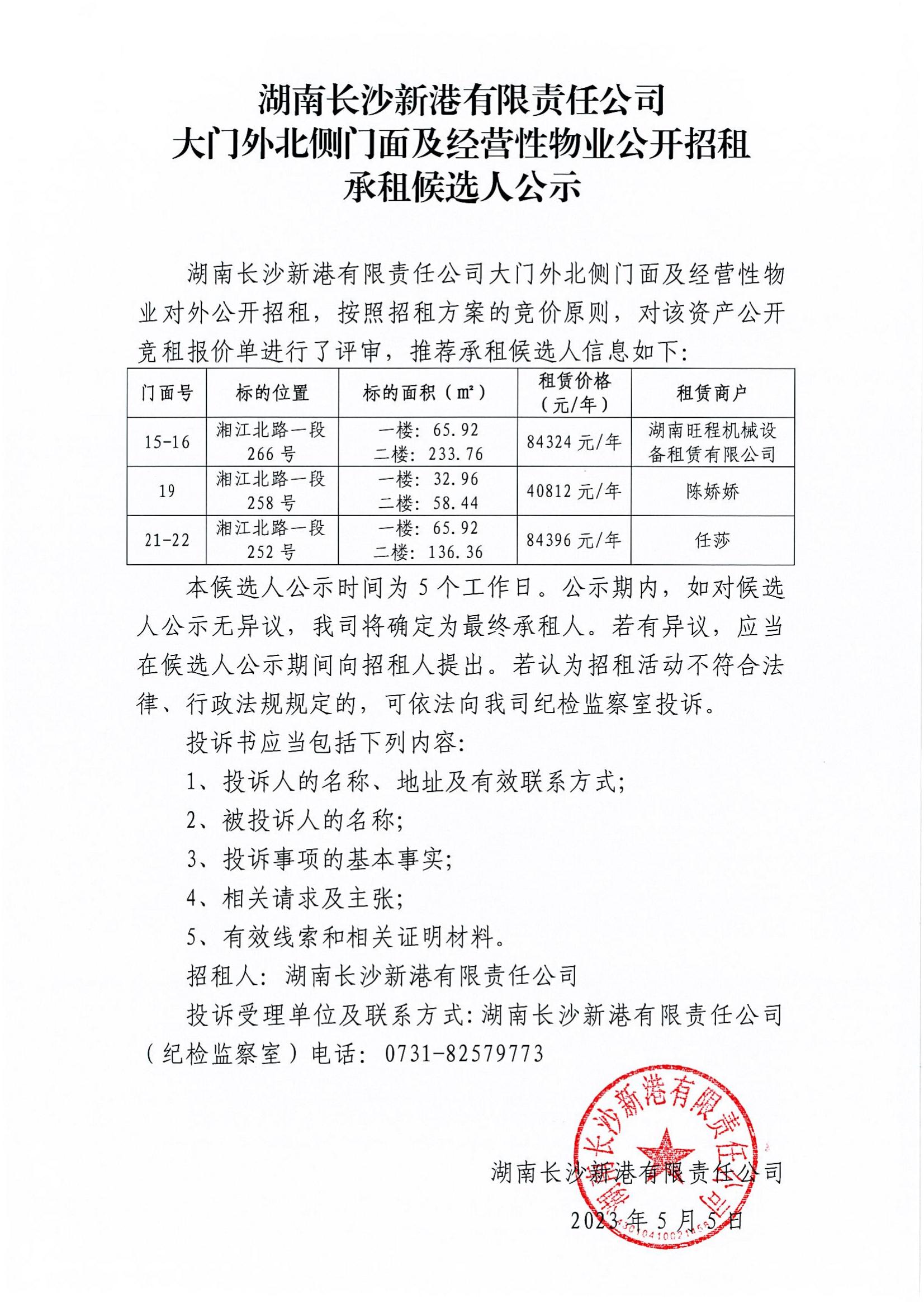 新港公司大門(mén)外北側(cè)門(mén)面及經(jīng)營(yíng)性物業(yè)公開(kāi)招租承租候選人公示
