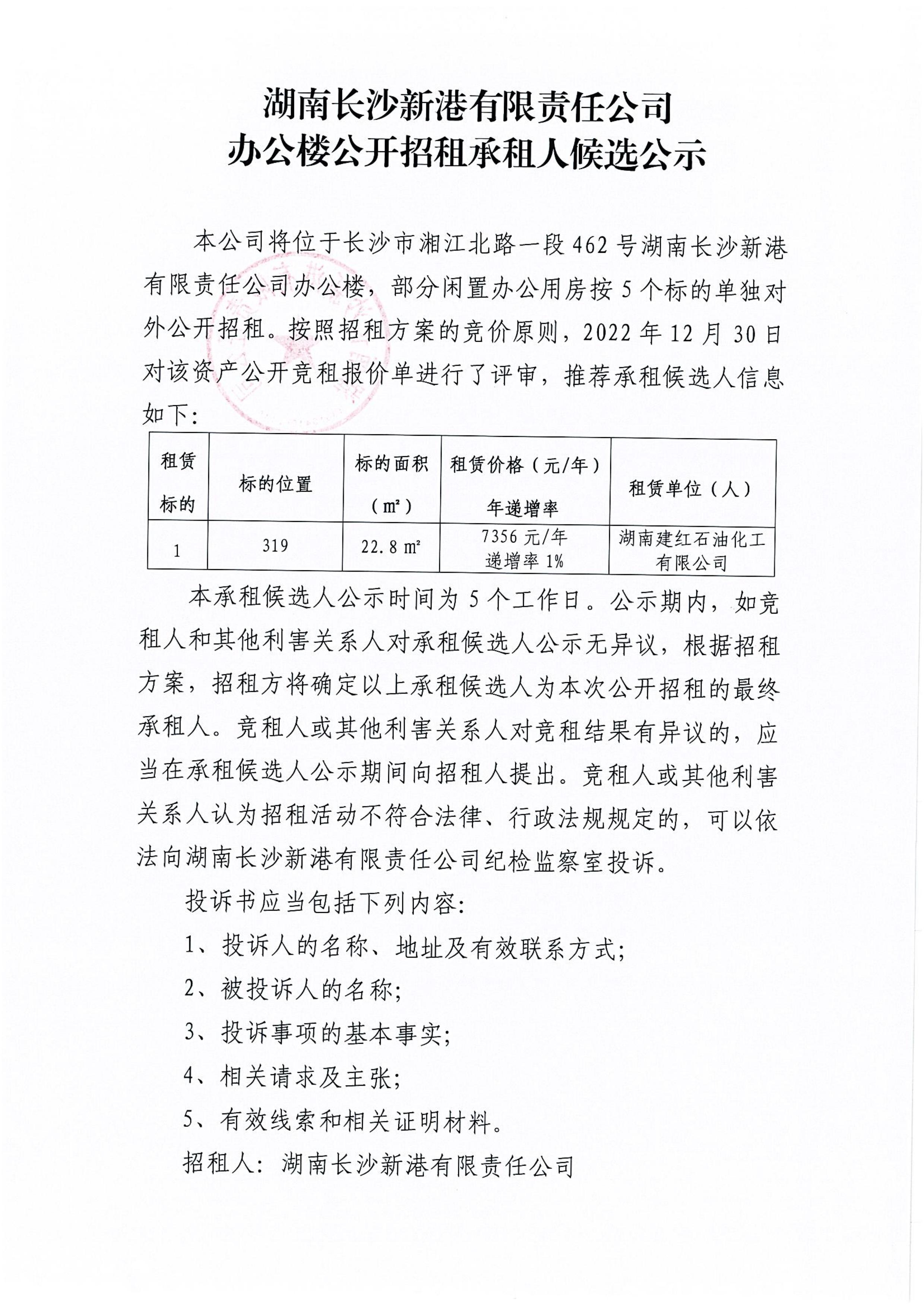 湖南長沙新港有限責(zé)任公司辦公樓公開招租承租人候選公示