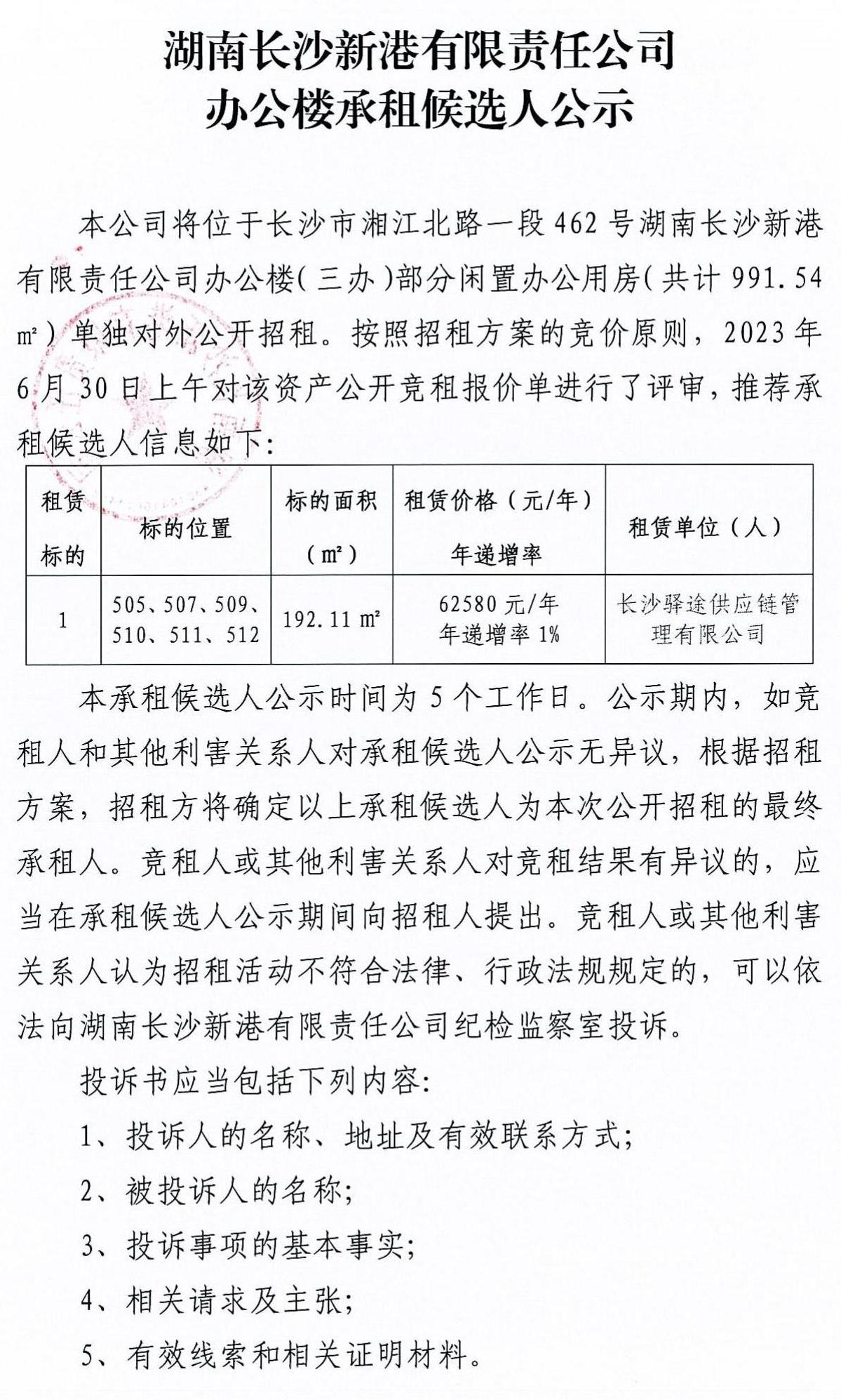 湖南長沙新港有限責(zé)任公司辦公樓承租候選人公示