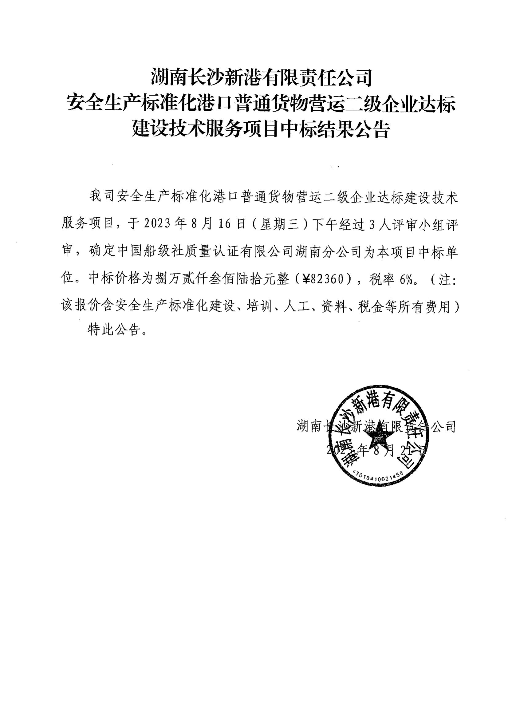 安全生產(chǎn)標(biāo)準(zhǔn)化港口普通貨物營運二級企業(yè)達(dá)標(biāo)建設(shè)技術(shù)服務(wù)項目中標(biāo)結(jié)果公告