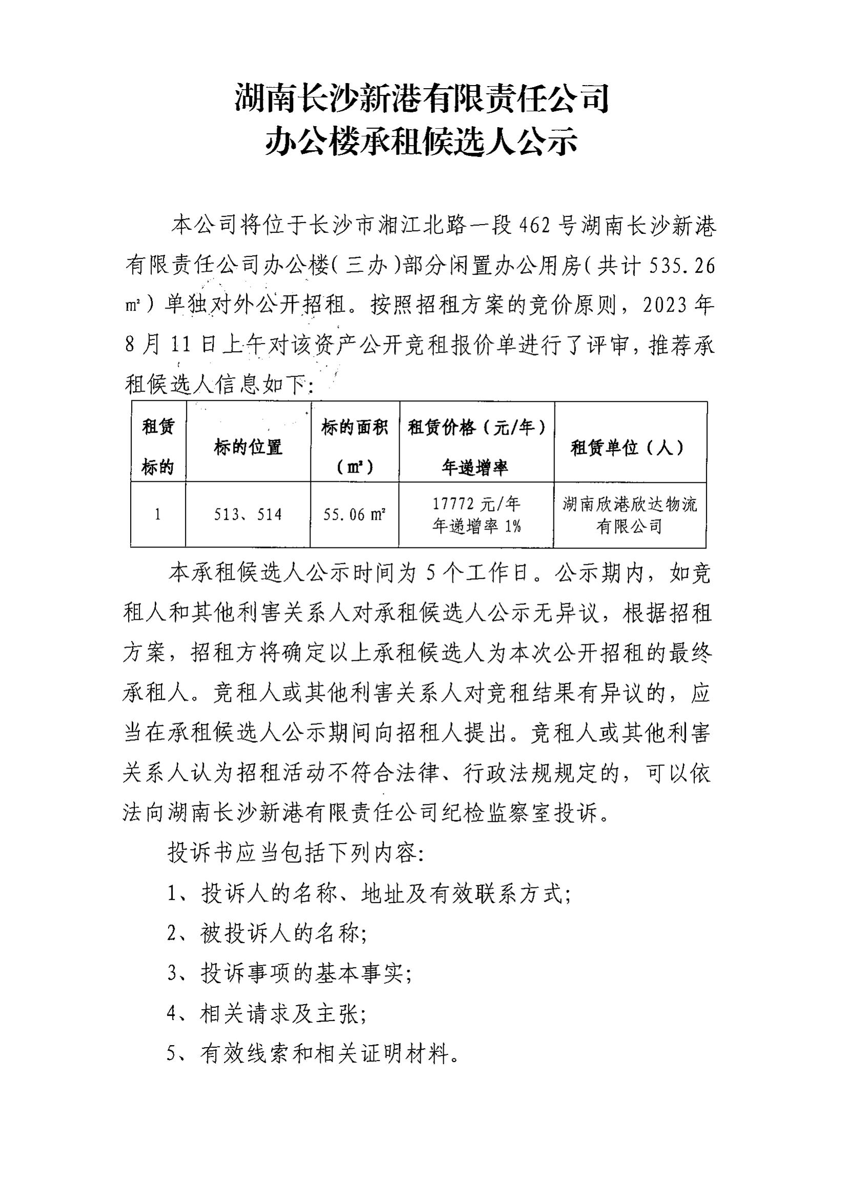 湖南長沙新港有限責(zé)任公司辦公樓承租候選人公示
